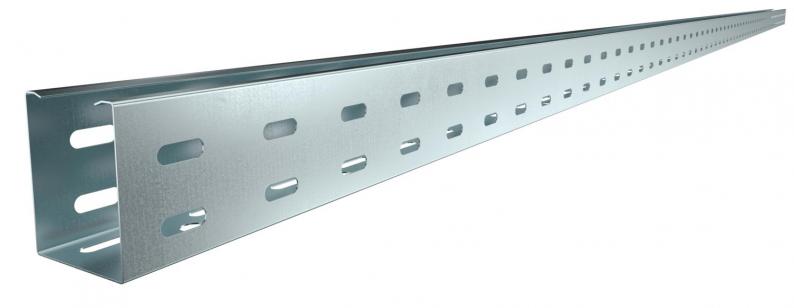 Kabelrinne mit durchgängiger Boden- und Seitenperforation sowie Mittellochung (Ø11 mm) im Boden für zusätzliche Befestigungen.