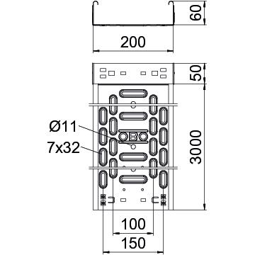 Kabelrinne mit integriertem Schnellbefestigungssystem. Bandverzinkte Oberfläche, pulverbeschichtet in tiefschwarz (RAL 9005). Durchgängige Seitenlochung von 7 x 20 mm für die Installation zusätzlicher Verbindungs- und Montagebauteile. Mit 11-mm-Lochung im Boden für die direkte Gewindestangenabhängung. Nutzlänge 3.000 mm.