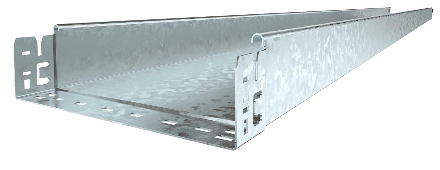 Ungelochte Kabelrinne mit integriertem Schnellbefestigungssystem. Die Nutzlänge der Kabelrinne beträgt 3.000 mm.