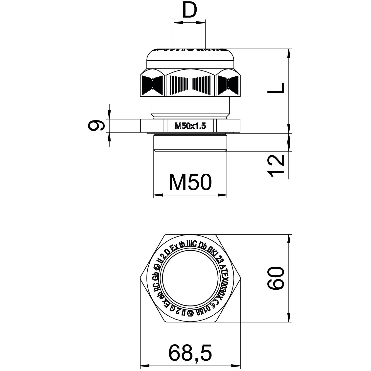 Kabelverschraubung mit EG-Baumusterprüfbescheinigung für Geräte und Schutzsysteme zur bestimmungsgemäßen Verwendung in explosionsgefährdeten Bereichen. Richtlinie 2014/34/EU.