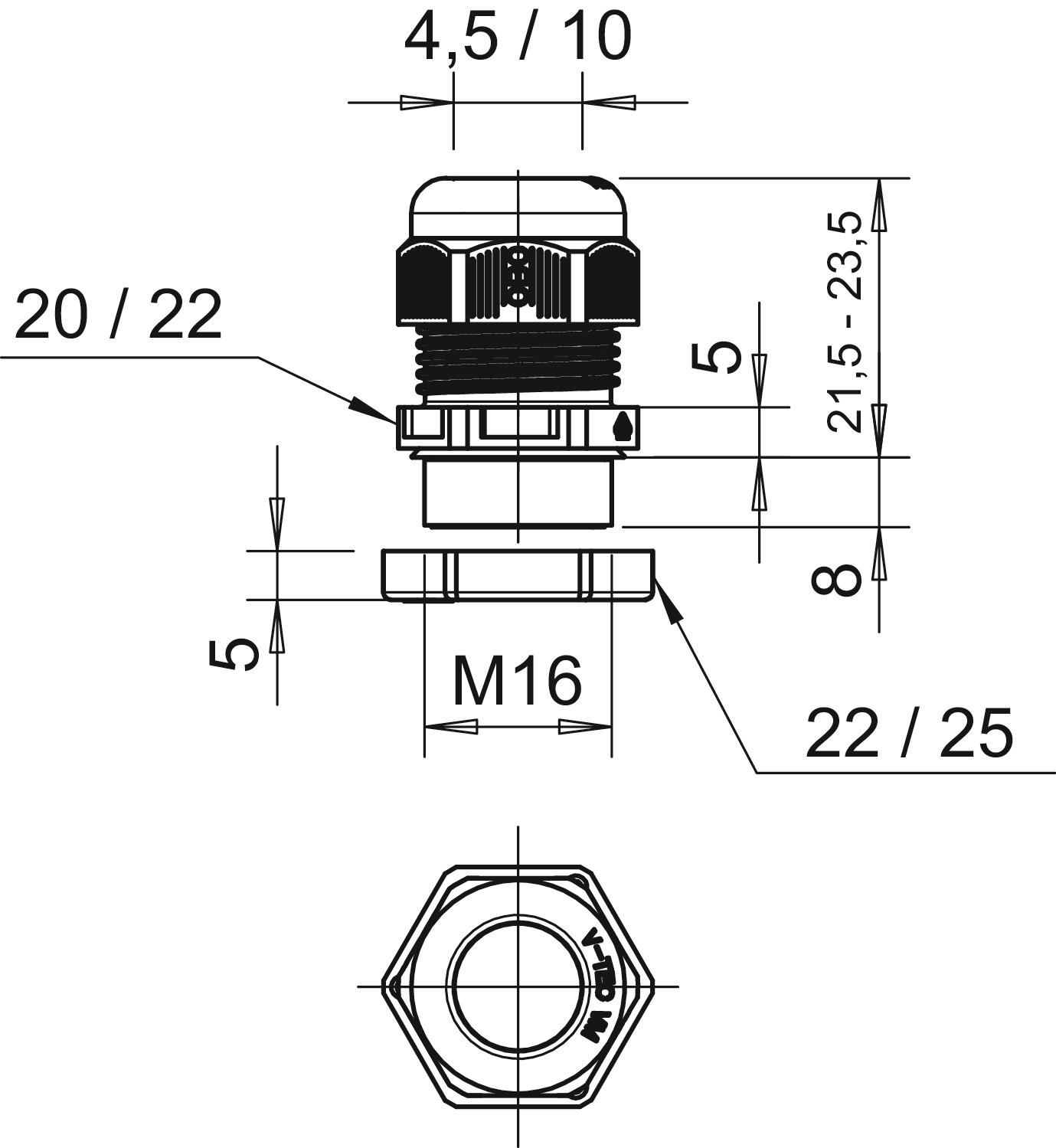 Kabelverschraubung mit metrischem Anschlussgewinde in Hutmutterbauart, für Kabelabzweigkästen, Gehäuse, Verteilerschränke im privaten und industriellen Bereich. Mit Zugentlastung und integrierter Dichtlippe, geprüft nach DIN EN 62444. Schutzklasse IP68. Einsetzbar von -20°C bis +65°C. Inklusive Gegenmutter.