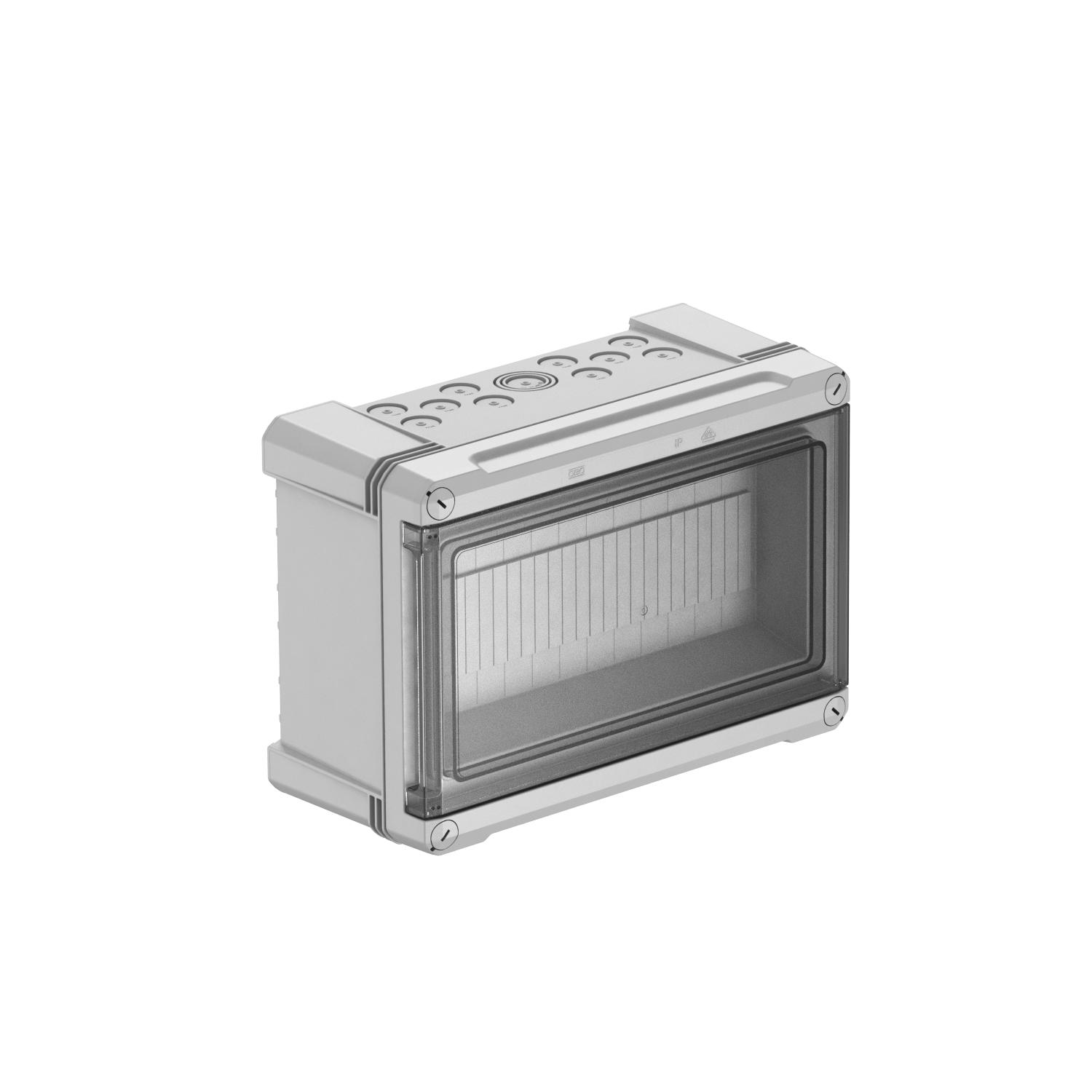 Kleinverteiler zur Aufputz-Montage, für die Strom-Unterverteilung im Innen- und Außenbereich, gemäß IEC 439-3. Mit vormontierter 35-mm-Hutprofilschiene. Schutzart IP66 und Schutzgrad IK08. Transparenter Deckel zum Schrauben, mit Ausschnitt. Inklusive 4 Schraubenabdeckkappen.