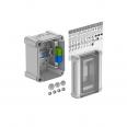 Kleinverteiler mit Klemmleiste zur Aufputz-Montage, für die Strom-Unterverteilung im Innen- und geschützten Außenbereich, gemäß IEC 439-3. Mit vormontierter 35-mm-Hutprofilschiene. Schutzart IP66 und Schutzgrad IK07. Transparenter Deckel zum Schrauben, mit Ausschnitt.