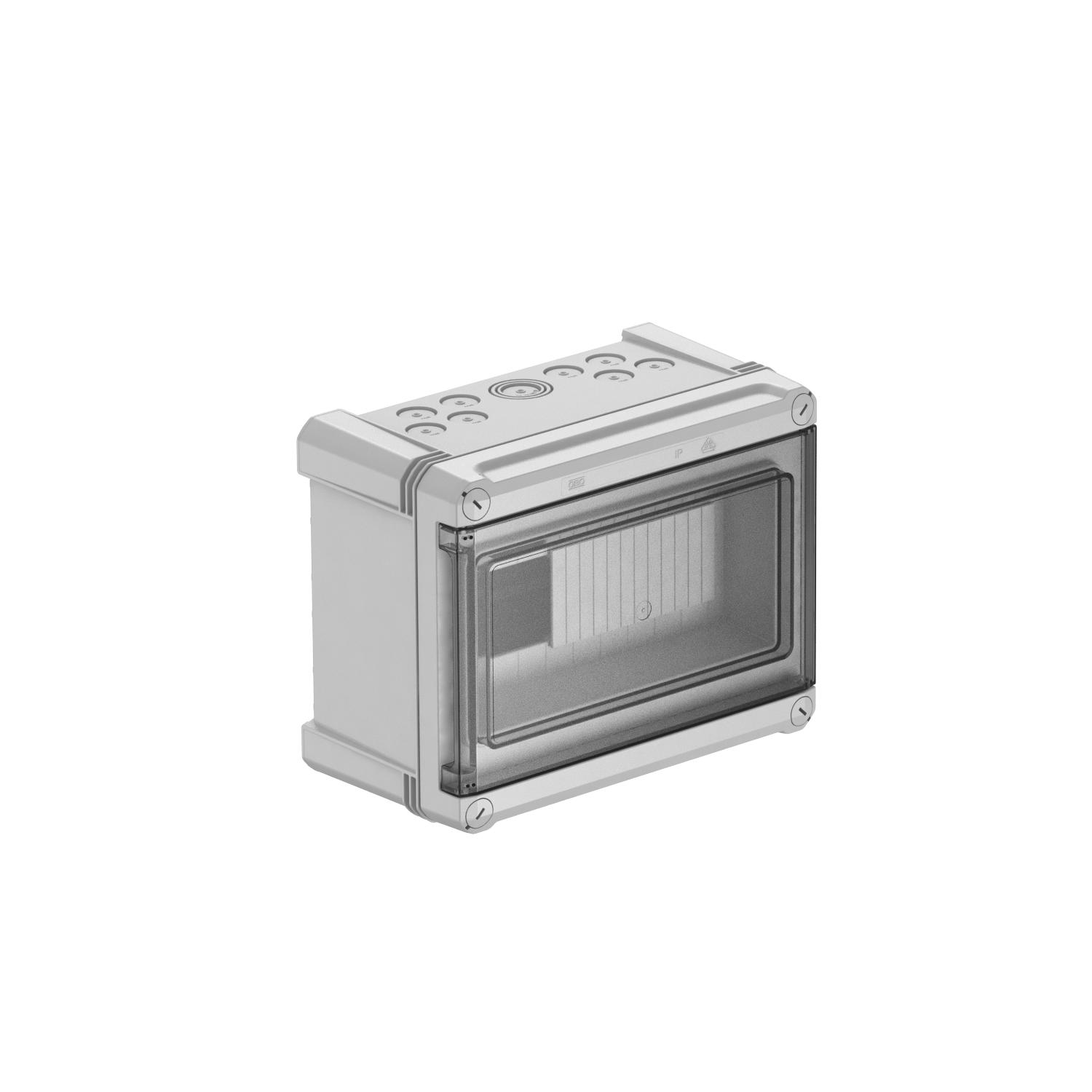 Kleinverteiler zur Aufputz-Montage, für die Strom-Unterverteilung im Innen- und geschützten Außenbereich, gemäß IEC 439-3. Mit vormontierter 35-mm-Hutprofilschiene. Schutzart IP66 und Schutzgrad IK07. Transparenter Deckel zum Schrauben, mit Ausschnitt.
