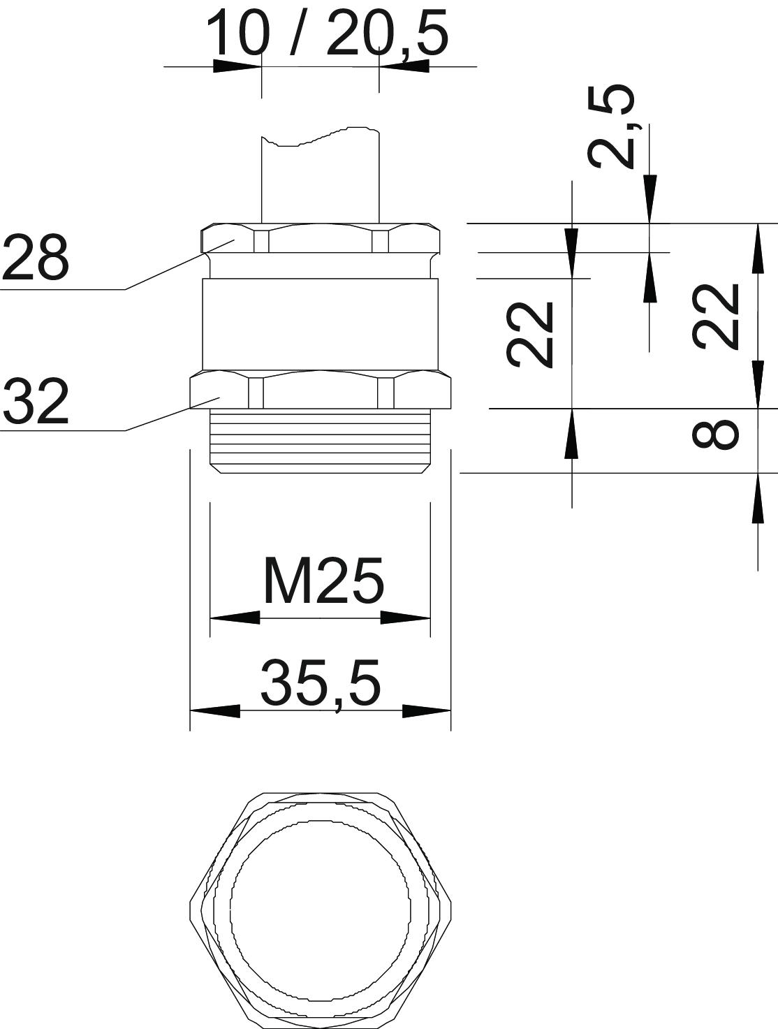 Kabelverschraubung mit Sechskant-Zwischenstutzen, Form C4 nach DIN 46320 mit metrischem Anschlussgewinde nach DIN EN 60423 bzw. ISO 68. Druckringe Stahl, galvanisch verzinkt und transparent passiviert. Dichtring aus NR/SBR.