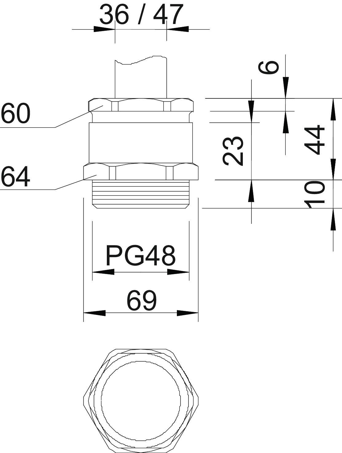 Kabelverschraubung mit Sechskant-Zwischenstutzen, Form C4 nach DIN 46320 mit PG-Anschlussgewinde nach DIN 40430.