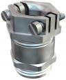 Kabelverschraubung mit zentrisch wirkender Querbügel-Zugentlastung in der Druckschraube, Biegeschutz beweglicher Leitungen durch stark gerundete Druckschraube.
