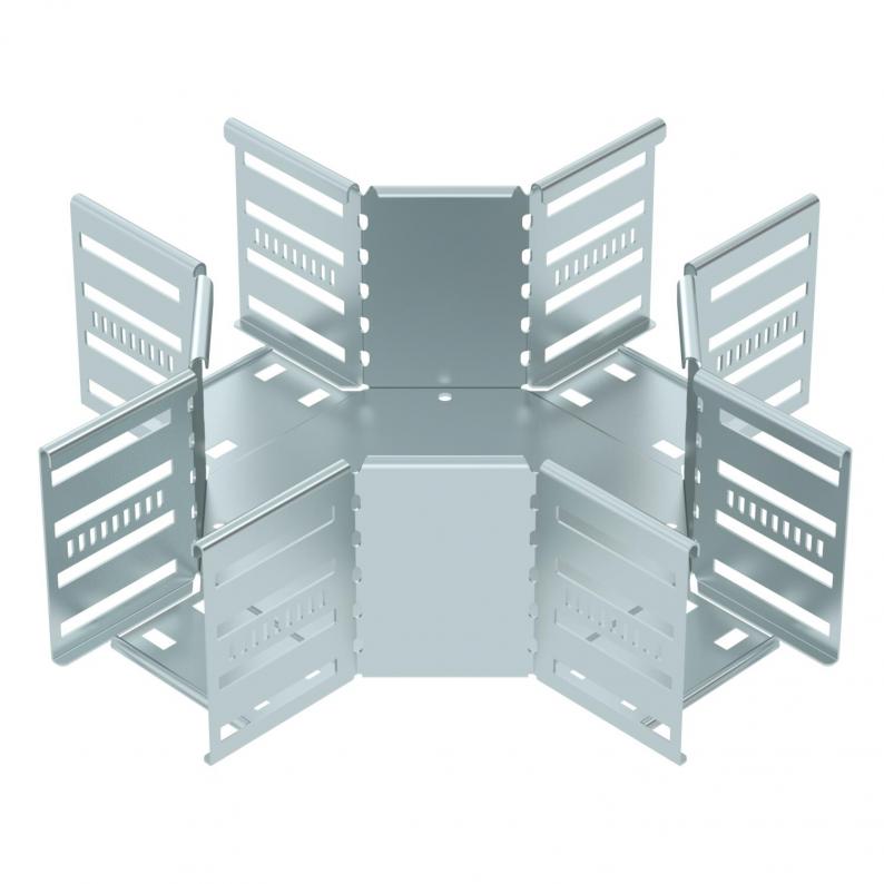 Kreuzung zum Erstellen einer horizontalen Abzweigung, Formteil für rast- und schraubbare Kabelrinnen Seitenhöhe 110 mm. Schraubenlose Montage mit Doppelklemmen oder Schraubverbindung mit Flachrundschrauben FRS und Kombimuttern M6. Einsetzbar im Innenbereich. Befestigungsmaterial muss separat bestellt werden.