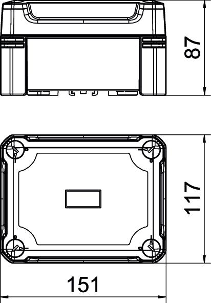 Kabelabzweigkasten mit Hutprofilschiene zum Verbinden von Kabeln und Leitungen im Innen- und Außenbereich. Rechteckige Form ohne Einführungen. Geeignet für die Wand-/ Deckenmontage mit der Möglichkeit zur Außenbefestigung, Innenbefestigung oder Montage über die Eckdome. Besonders schlagfest mit IK09. Transparenter Deckel mit Schnellverschluss, plombierbar. Hergestellt aus halogenfreien und UV-resistenten Materialien.