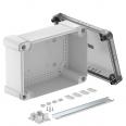 Kabelabzweigkasten mit Hutprofilschiene zum Verbinden von Kabeln und Leitungen im Innen- und Außenbereich. Rechteckige Form ohne Einführungen. Geeignet für die Wand-/ Deckenmontage mit der Möglichkeit zur Außenbefestigung, Innenbefestigung oder Montage über die Eckdome. Besonders schlagfest mit IK08. Transparenter Deckel mit Schnellverschluss, plombierbar. Hergestellt aus halogenfreien und UV-resistenten Materialien.