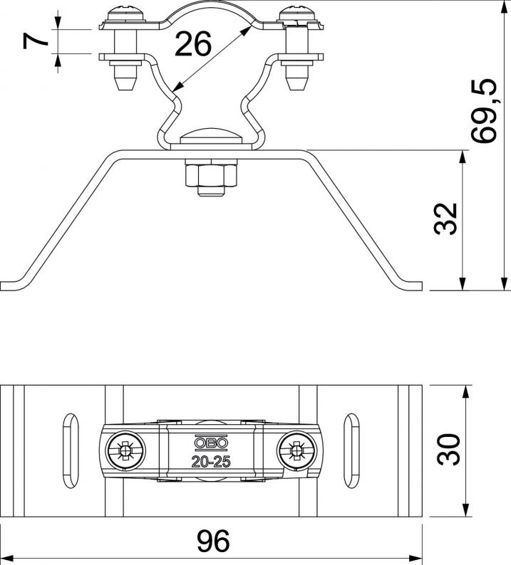 Leitungshalter mit Spannband für isCon®-Ableitung, zum Montieren an Rohren mit ø ≤ 600 mm. Inklusive Federscheiben zur Schraubsicherung gegen Selbstlockern.