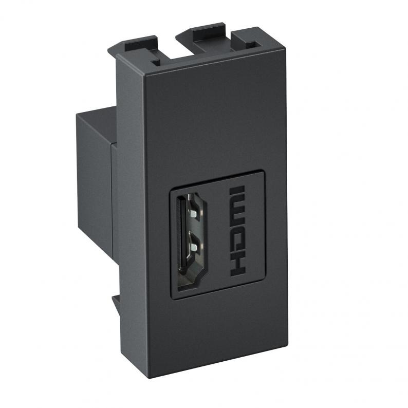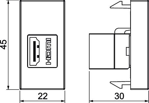 Multimediaträger mit einer HDMI-Anschlussbuchse, Anschluss von HDMI-Buchse zu HDMI-Buchse. Auflösung bis zu 4 K 60 Hz. Trägerplatte mit Rastbefestigung, geeignet für den senkrechten Einbau in die Systemumgebung. Zur Installation in der Deskbox DBL.