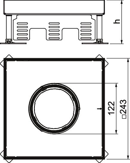 Nivellierbare quadratische Kassette für Tubus der Nenngröße 9 für den Einbau von Installationsgeräten in Kanalsystemen, Doppel- und Hohlböden in trocken oder nass gepflegten Fußböden im Innenbereich. Nur passend für glatte Bodenbeläge.