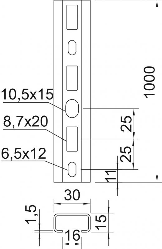 Profilschiene, gelocht, mit 16 mm Schlitzweite.