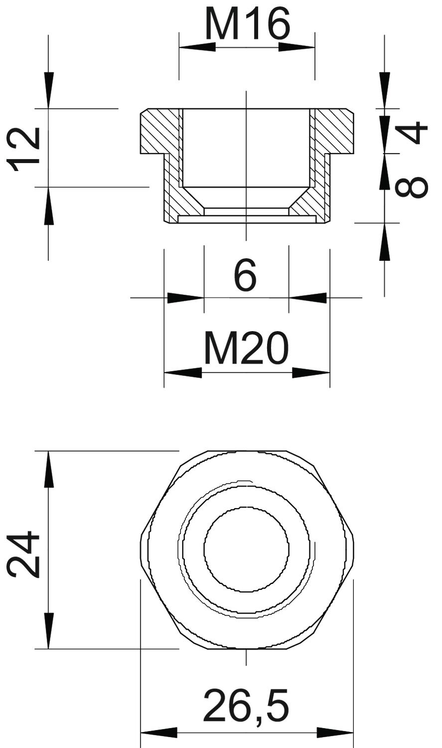 Reduktion mit metrischem Innen- und Außengewinde für die Montage von Kunststoff-Kabelverschraubungen an Gehäusen. Schutzart IP54 ohne zusätzliche Anschlussdichtung. Schutzart bis IP68 möglich mit zusätzlicher Anschlussdichtung, zum Beispiel O-Ring oder Flachdichtring.