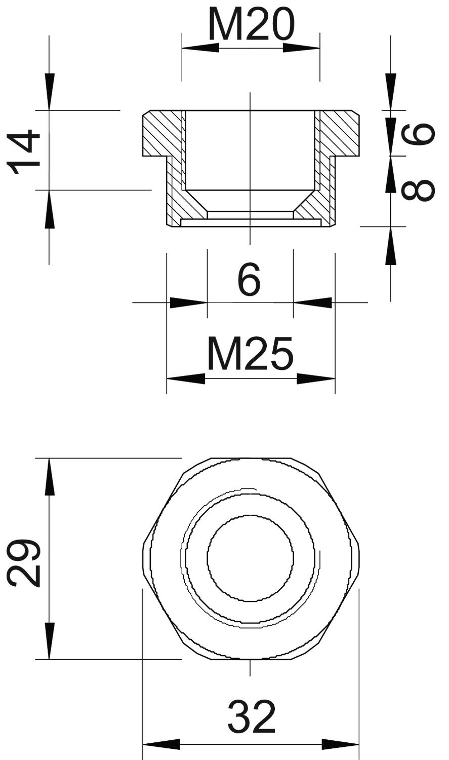 Reduktion mit metrischem Innen- und Außengewinde für die Montage von Kunststoff-Kabelverschraubungen an Gehäusen. Schutzart IP54 ohne zusätzliche Anschlussdichtung. Schutzart bis IP68 möglich mit zusätzlicher Anschlussdichtung, zum Beispiel O-Ring oder Flachdichtring.