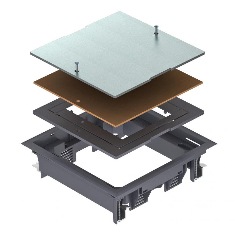 Zugdoseneinsatz zum Blindverschluss einer quadratischen Montageöffnung der Nenngröße 4, Einsatz in Kanalsystemen und Systemböden im Innenbereich.