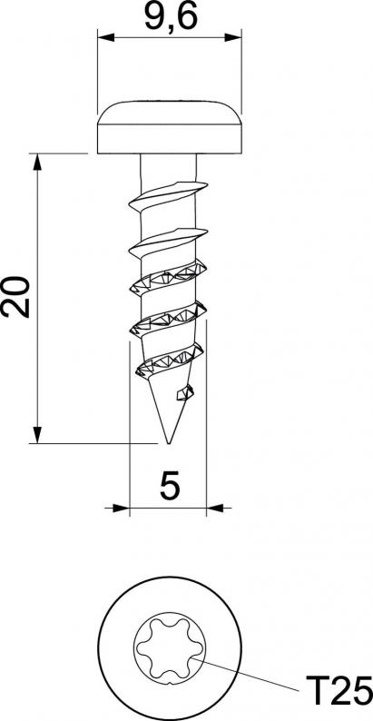 Schraube mit speziellen Fräsrippen für Brandschutzkanal PYROLINE® Con D und PYROLINE® Con S, zur Befestigung von Kabelschellen im Kanal. Erforderliche Plattendicke mindestens 20 mm.