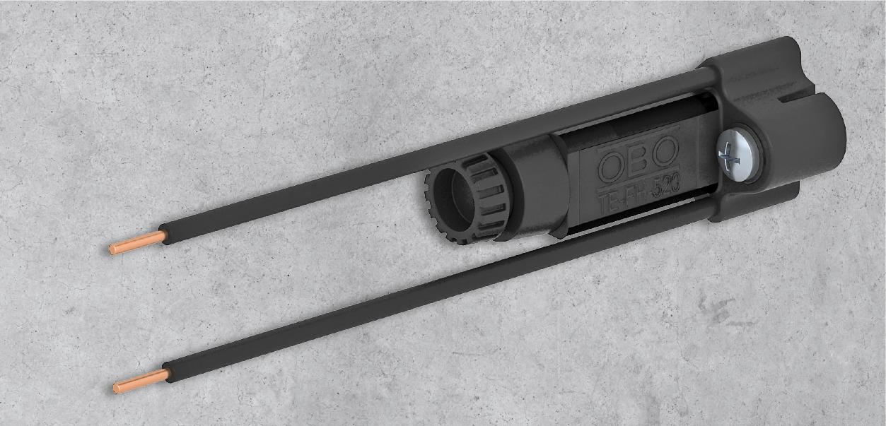Sicherungshalter mit Bajonettverschluss für Feinsicherung der Abmessung Ø 5 x 20 mm. Funktionserhalt-Anschlussadern mit Nennquerschnitt 2,5 mm², fertig abisoliert. Zur Montage auf einem der freiliegenden Dome in Abzweigkästen der FireBox T-Serie mittels beiliegender Schraube.