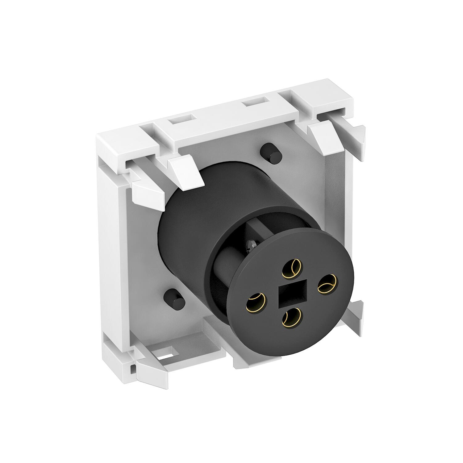 Multimediaträger mit einer Speakon-Anschlussbuchse, Kabelauslass gerade, ohne Beschriftungsfeld, Speakon-Buchse 4-polig mit Schraubanschluss. Trägerplatte mit Rastbefestigung, geeignet für den waagerechten und senkrechten Einbau in die Systemumgebung.
