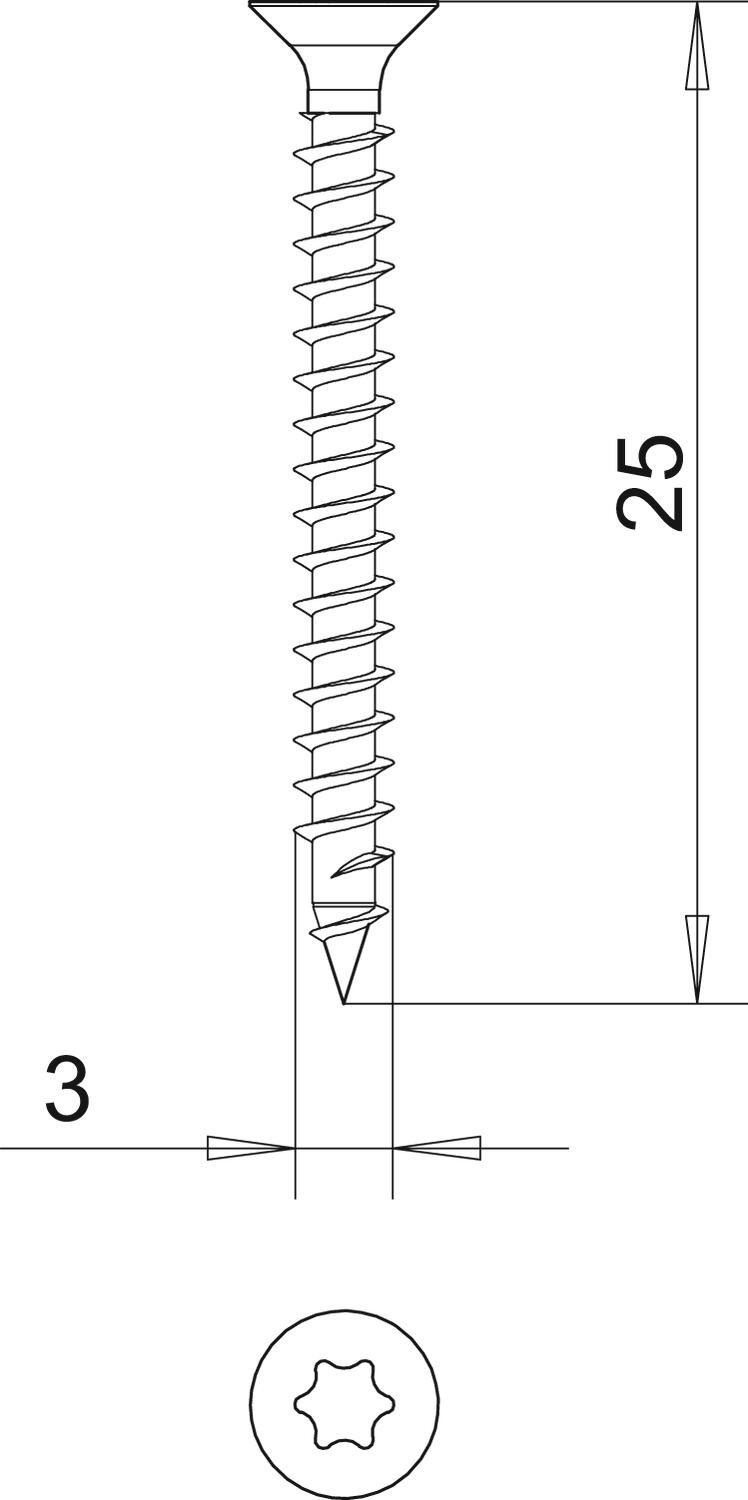 Stahl gehärtet, galvanisch verzinkt und hostaflonbeschichtet. Senkkopf mit T-Bit (Innensechsrund), die Gr. Ø 3 mm T10, Ø 3,5 mm T15, Ø 4 und 4,5 mm T20, Ø 5 mm T25.