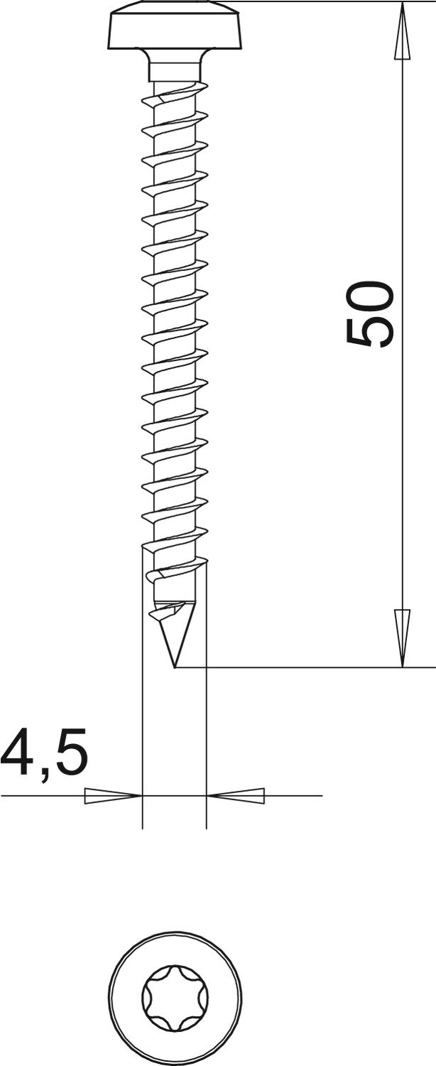 Stahl gehärtet, galvanisch verzinkt und gelb passiviert, sowie Hostaflonbeschichtet, Panhead mit T-Bit (Innensechsrund), die Gr. Ø 3 mm T10, Ø 3,5 mm T15, Ø 4 und 4,5 mm T20, Ø 5 mm T25.