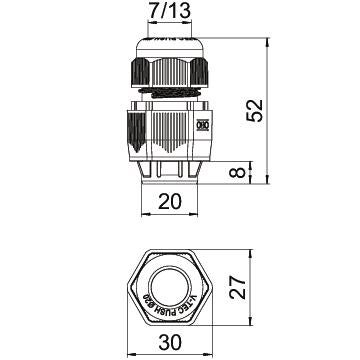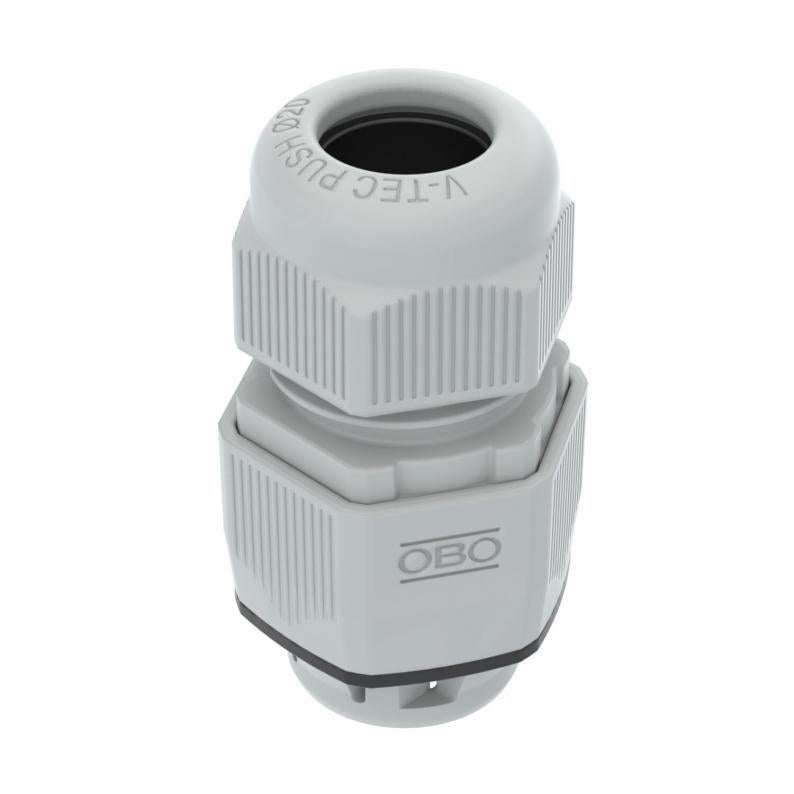 Kabelverschraubung V-TEC PUSH® mit patentiertem Rastsystem und Metallfeder, zum Einsatz in z. B. Kabelabzweigkästen, Gehäusen oder Verteilerschränken im privaten und industriellen Bereich. Einseitig steckbar, schraublose Befestigung, keine Gegenmutter erforderlich. Wieder lösbar mit beiliegendem Demontagewerkzeug. Geeignet für Wandstärken von 1-3 mm. Mit Zugentlastung und integrierter Dichtlippe, geprüft nach DIN EN 62444. Schutzklasse bis IP66. Einsetzbar von -20°C bis +65°C.