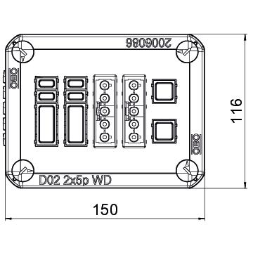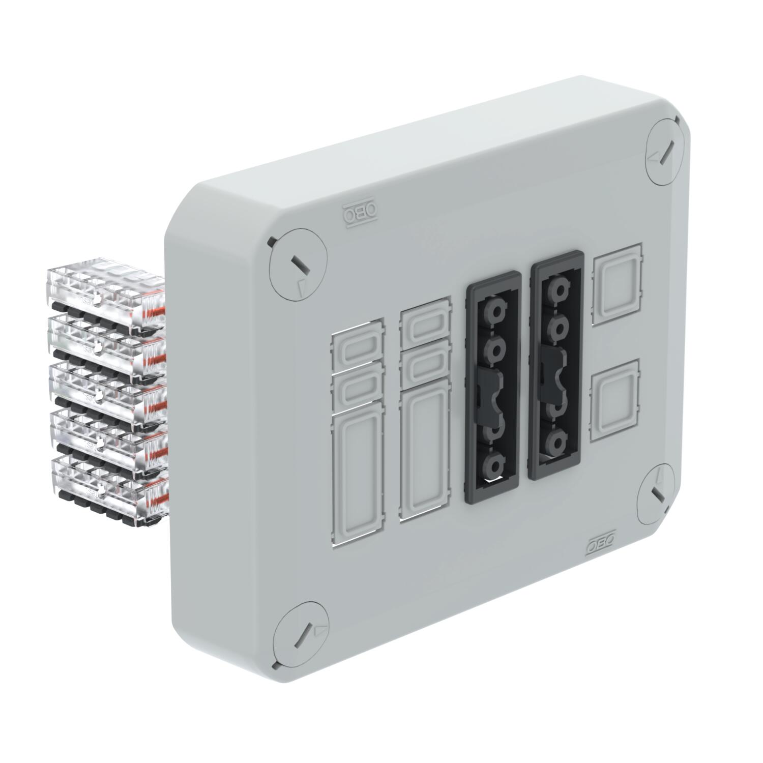 Steckbarer Deckel zum Verschließen von Kabelabzweigkästen, bestückt mit 2 Wieland GST18-Stecksystemen, vorverdrahtet mit Hebelsteckklemmen. Mit Schnellverschluss im Deckel, plombierbar. Halogenfreies Material, UV-resistent. Flammwidrig nach DIN EN 60695-2-11, Prüftemperatur 650°C. Schlagfestigkeit IK07 bei Raumtemperatur. Schutzart IP30.
