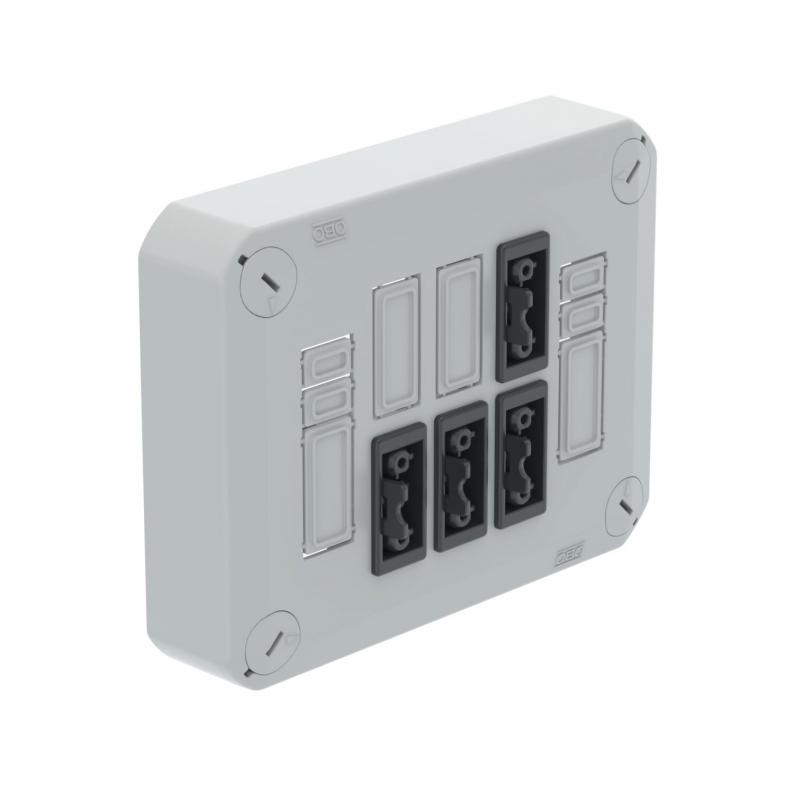 Steckbarer Deckel zum Verschließen von Kabelabzweigkästen, bestückt mit 4 Wieland GST18-Stecksystemen, vorverdrahtet mit Hebelsteckklemmen. Mit Schnellverschluss im Deckel, plombierbar. Halogenfreies Material, UV-resistent. Flammwidrig nach DIN EN 60695-2-11, Prüftemperatur 650°C. Schlagfestigkeit IK07 bei Raumtemperatur. Schutzart IP30.