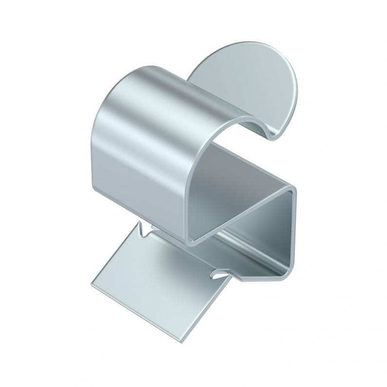 Trägerklammer zum Montieren von Kabeln. Offene Kabelaufnahme seitlich. Befestigung an Stahträgern durch Aufschlagen.