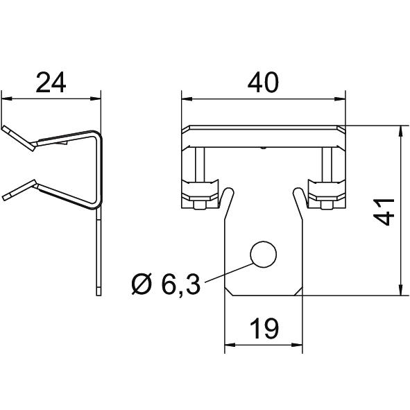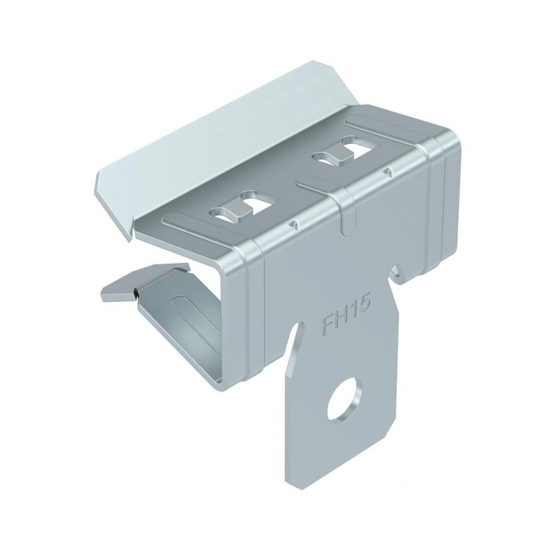 Trägerklammer mit Bohrung für individuelle Montagelösungen, z. B. für die Aufnahme von S-Haken oder Ketten. Befestigung an Stahträgern durch Aufschlagen.