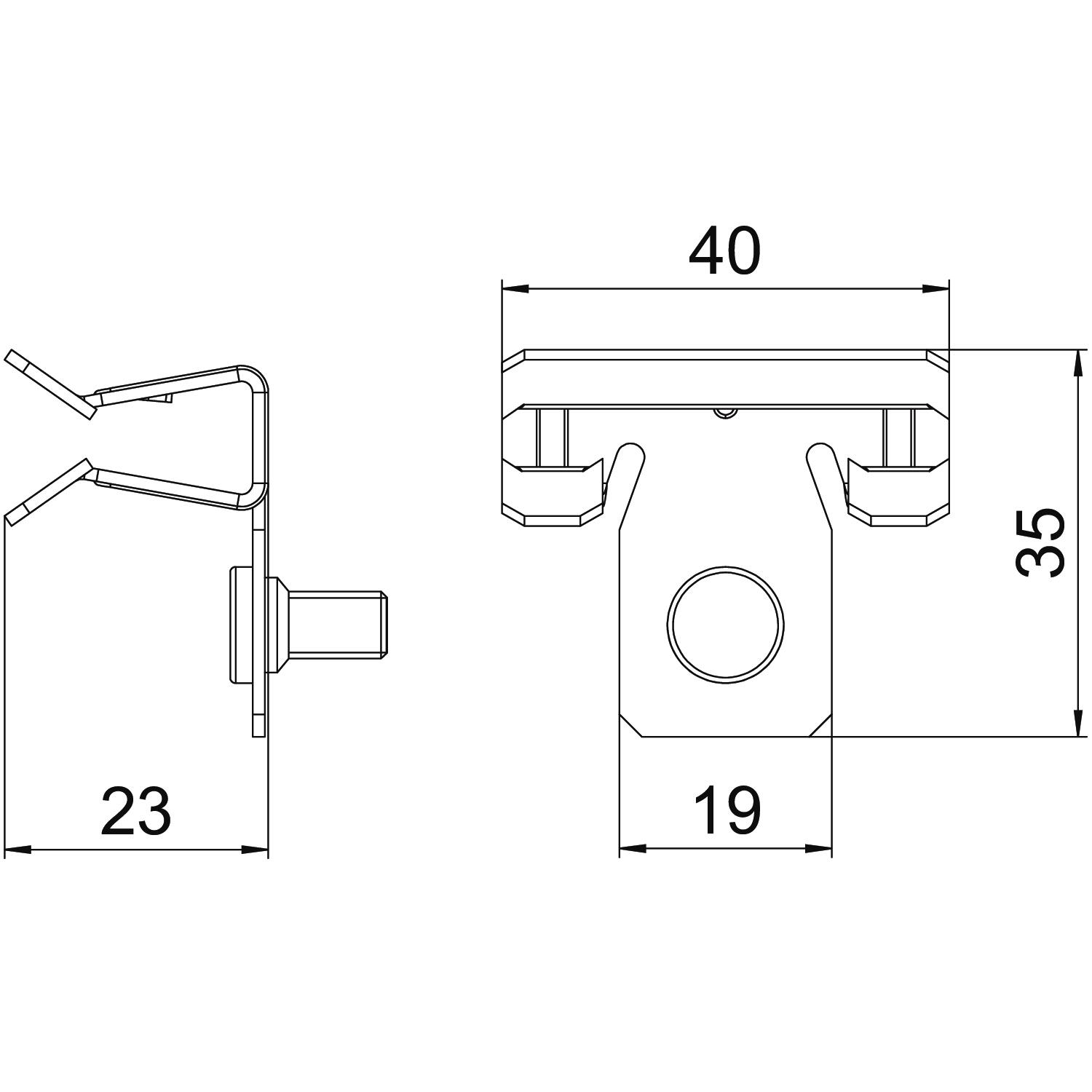 Trägerklammer mit Gewindebolzen M6 seitlich für individuelle Montagelösungen. Befestigung an Stahträgern durch Aufschlagen.