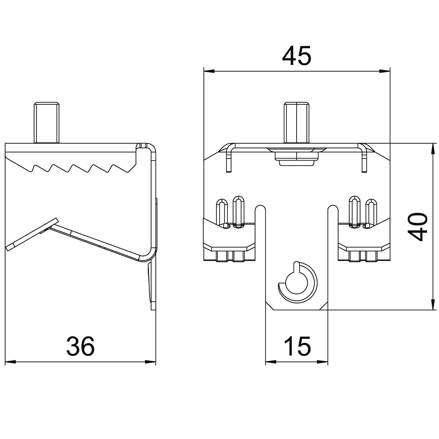 Trägerklammer mit Gewindebolzen M6 unten für individuelle Montagelösungen. Befestigung an Stahträgern durch Aufschlagen.