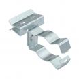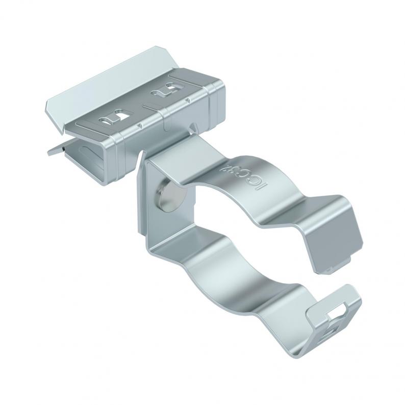 Trägerklammer zum Montieren von Rohren. Geschlossene Rohraufnahme seitlich. Befestigung an Stahträgern durch Aufschlagen.