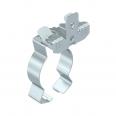 Trägerklammer zum Montieren von Rohren. Geschlossene Rohraufnahme unten. Befestigung an Stahträgern durch Aufschlagen.