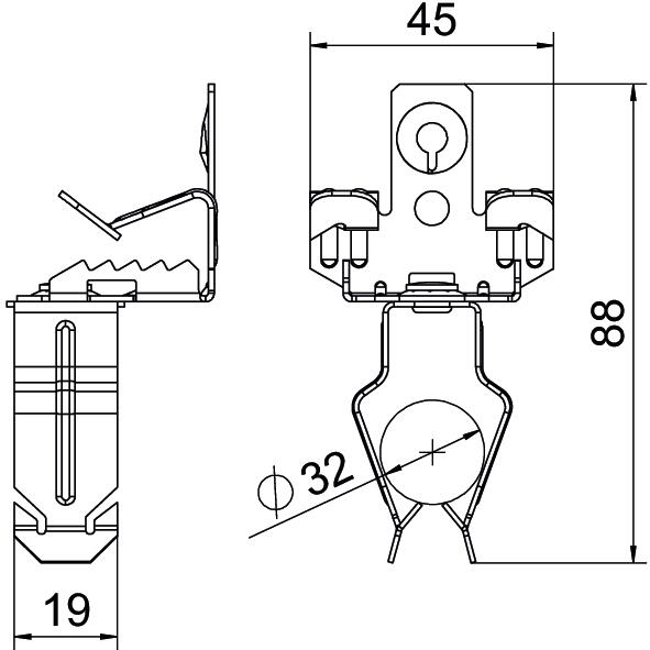 Trägerklammer zum Montieren von Rohren. Offene Rohraufnahme unten. Befestigung an Stahträgern durch Aufschlagen.
