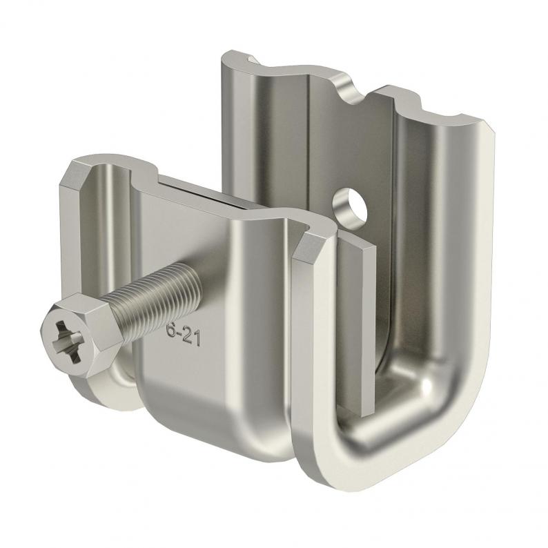 Diese Art Trägerklammer wird auf den Träger aufgeschoben und mittels einer Druckwanne und Schraube (M8) am Träger oder Flacheisen fixiert. Die Sechskantschraube hat eine Schlüsselweite von 10 mm. Im Schellenkörper sind außerdem zwei weitere M8 Gewinde eingebracht, um zum Beispiel Gewindestangen zu befestigen.