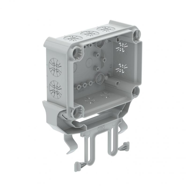 Steckbares Unterteil Kabelabzweigkasten mit Universal-Befestigungselement zur Montage an Kabelrinnen. Unbestückt, ohne Deckel. Halogenfreies Material und UV-resistent. Flammwidrig nach DIN EN 60695-2-11, Prüftemperatur 650°C. Schlagfestigkeit IK07 bei Raumtemperatur. Schutzart IP30.