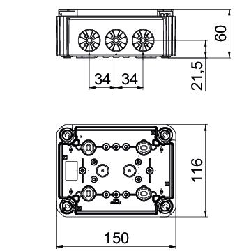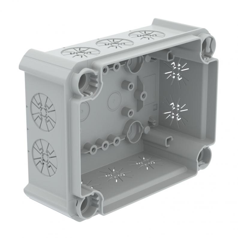 Steckbares Unterteil Kabelabzweigkasten. Unbestückt, ohne Deckel. Halogenfreies Material und UV-resistent. Flammwidrig nach DIN EN 60695-2-11, Prüftemperatur 650°C. Schlagfestigkeit IK07 bei Raumtemperatur. Schutzart IP30.