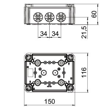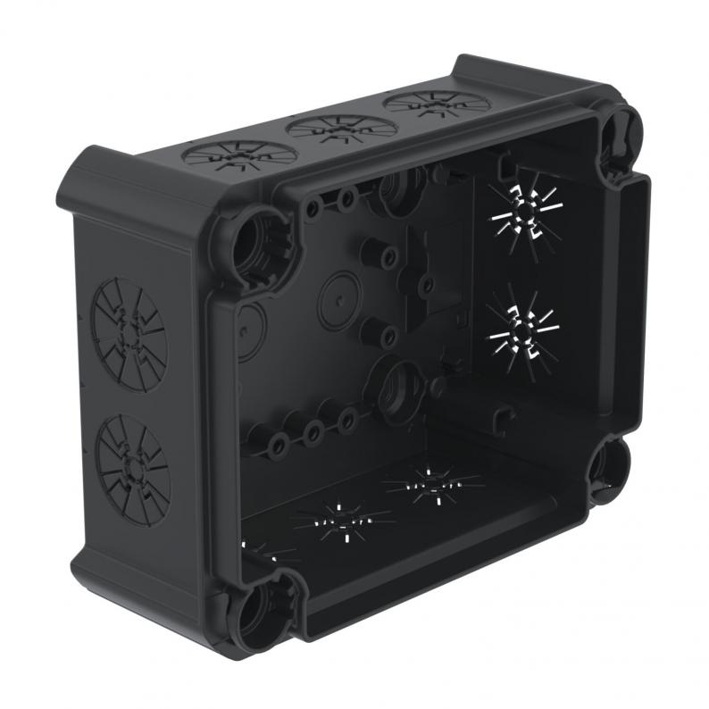 Steckbares Unterteil Kabelabzweigkasten. Unbestückt, ohne Deckel. Halogenfreies Material und UV-resistent. Flammwidrig nach DIN EN 60695-2-11, Prüftemperatur 650°C. Schlagfestigkeit IK07 bei Raumtemperatur. Schutzart IP30.