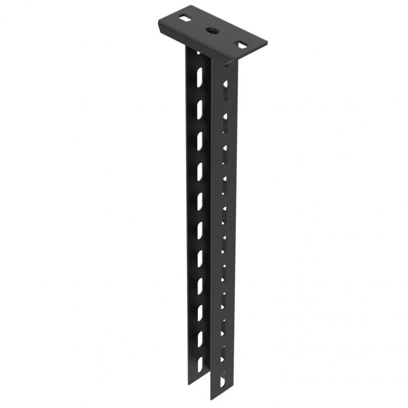 Hängestiel aus U-Profil mit angeschweißter Kopfplatte, 3-seitig gelocht, zum Erstellen von Tragkonstruktionen für Kabeltrassen. Geeignet für Montage an waagerechten Betondecken und Stahlträgern. Wand- und Stielausleger können beidseitig am U-Hängestiel montiert werden. Einsatz Distanzstück DSK ab Auslegerbreite 400 mm oder bei Montage des Auslegers am Ende des Hängestiels. Mit schwarzer Pulverbeschichtung.