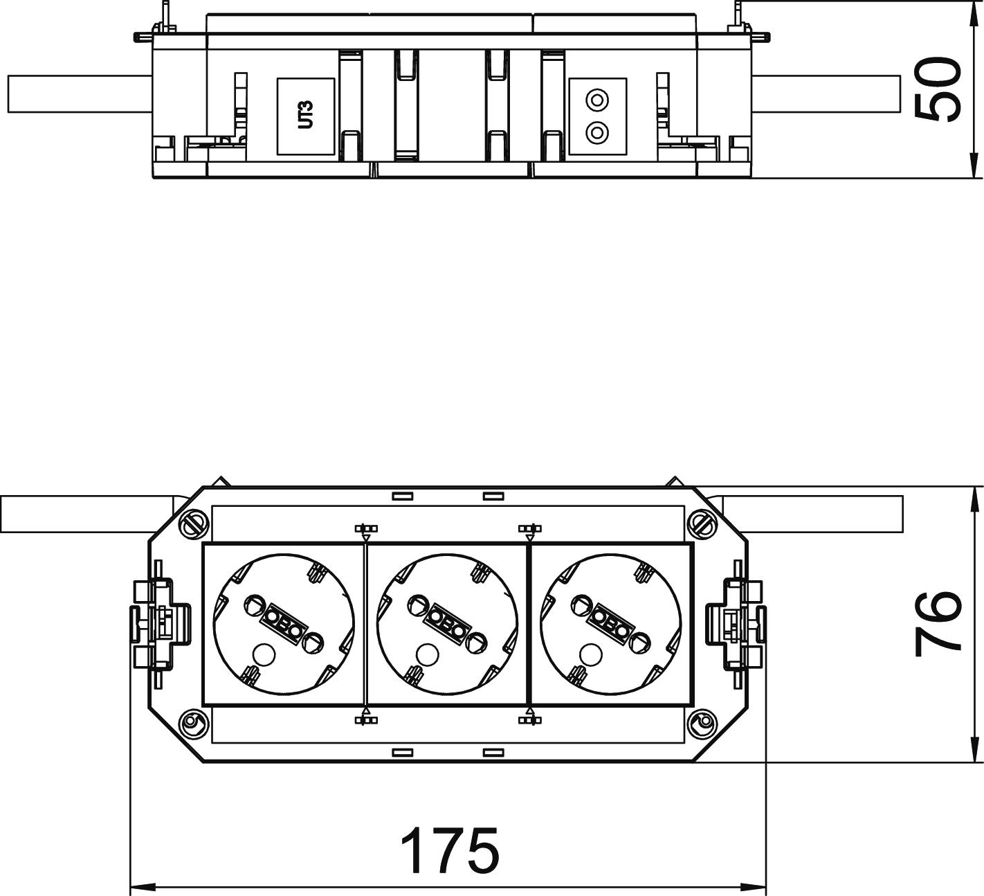 Der anschlussfertige Universalträger UTC3 verfügt über 2 vorinstallierte 33°-Schutzkontaktsteckdosen in weiß mit 16 A und eine vorinstallierte 33°-Schutzkontaktsteckdosen in orange mit 16 A. Passend zu den Verbindungsleitungen VL und den Geräteeinbaueinheiten der Nenngröße 2, 4, R4, 6 und R7.