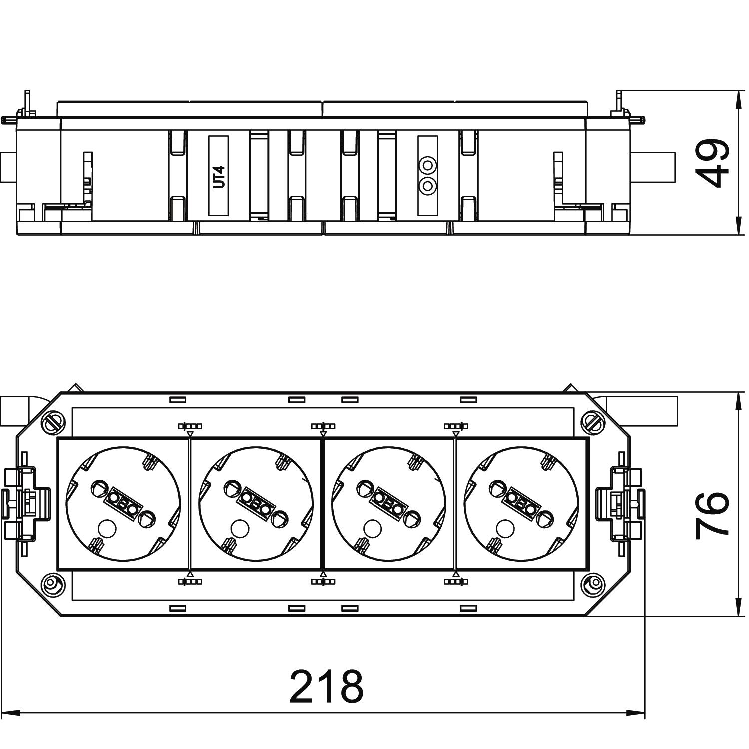 Der anschlussfertige Universalträger UTC4 verfügt über 3 vorinstallierte 33°-Schutzkontaktsteckdosen in weiß und eine vorinstallierte 33°-Schutzkontaktsteckdose in orange, 250 V~ 16 A. Mit halogenfreier Anschlussleitung. Passend zu den Verbindungsleitungen VL und den Geräteeinbaueinheiten der Nenngröße R7, R9 und 9.