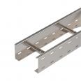 Weitspann-Kabelleiter mit gelochtem Seitenholm in 110 mm Seitenhöhe. Befestigung von Kabeln und Leitungen mit Bügelschelle Typ 2056.