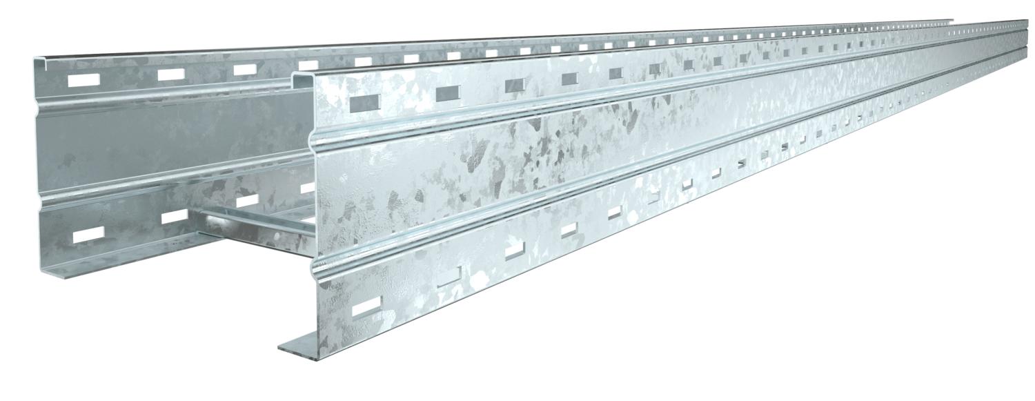 Weitspannkabelleiter mit gelochtem Seitenholm in 160 mm Seitenhöhe. Befestigung von Kabeln und Leitungen mit Bügelschelle Typ 2056.