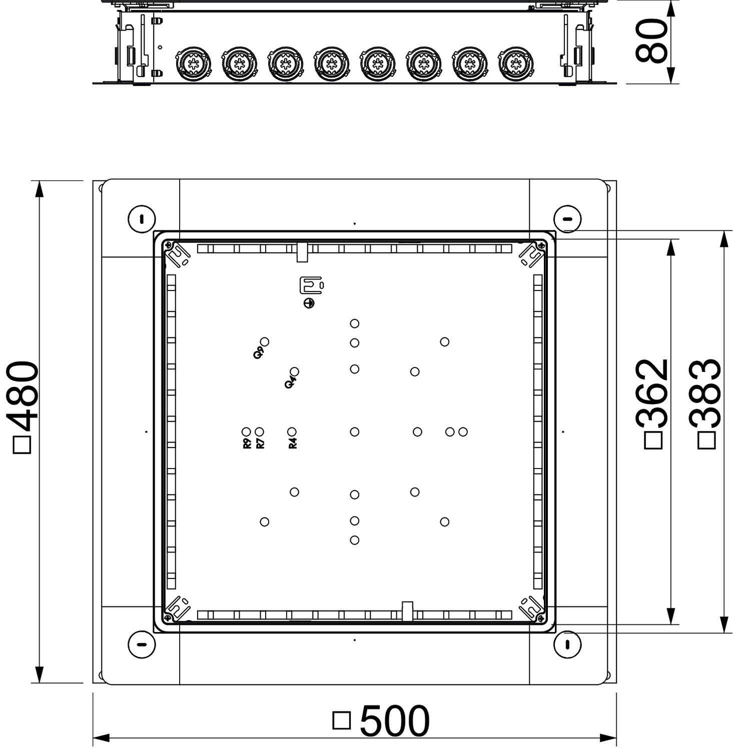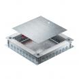 Zug- und Abzweigdose UZD350-4 R mit Seitenwänden aus Stahlblech. Zur Montage von Einbaueinheiten im Montagedeckel (separat zu bestellen). Lässt sich stufenlos mit der Schnellnivellierung auf eine Estrichnennhöhe von 80 - 160 mm nivellieren. Der Estrich kann bündig an die Estrichabzugskante angearbeitet werden. Mit schalltechnischer Entkopplungsmöglichkeit nach der Estrichverlegung und mit Systemzubehör auch für Schwerlastanwendung verwendbar. Einführung der Kabel und Leitungen durch die Rohreinführungen. Rohreinführung pro Seite für je 8 Installationsrohre in den Durchmessern M20, M25 und M32 geeignet.