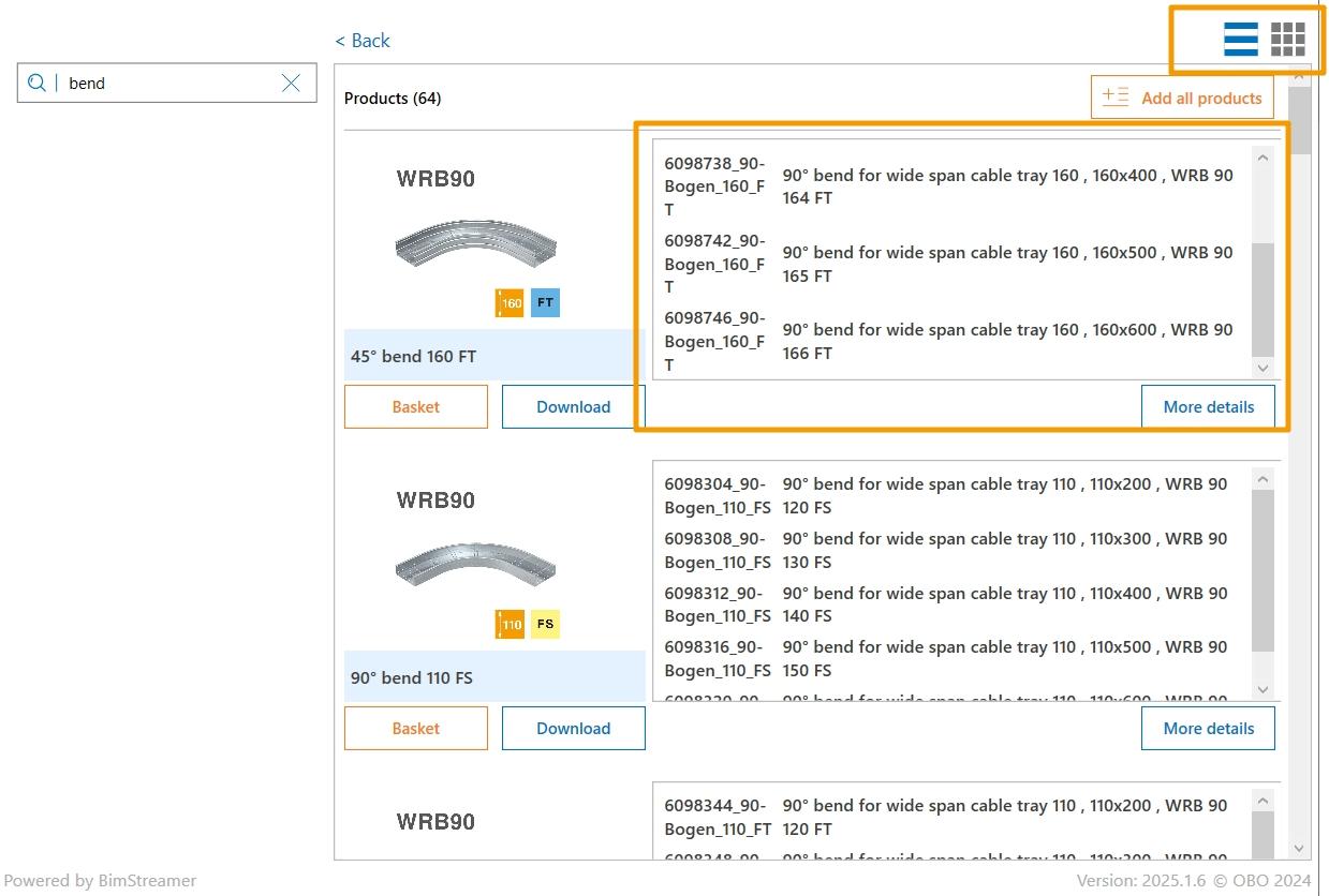 Sobald Sie Ihre Produktfamilie gefunden haben, können Sie diese in der Produktansicht entweder in den Warenkorb legen oder direkt ins Revit laden. Über den Einstellknopf in der rechten oberen Ecke können Sie die Ansicht ändern und sehen alle Artikel der jeweiligen Familie.