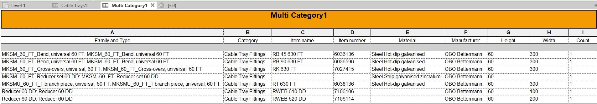 Das Stücklistentool (BOM) ermöglicht Ihnen die spezifische Auswertung und den Export der verplanten OBO Artikeln. Sie erhalten eine Auswertung der im Routing verwendeten Standardtrassenelemente (CableTrays1) sowie der verwendeten Formteile (Multicategory 1).