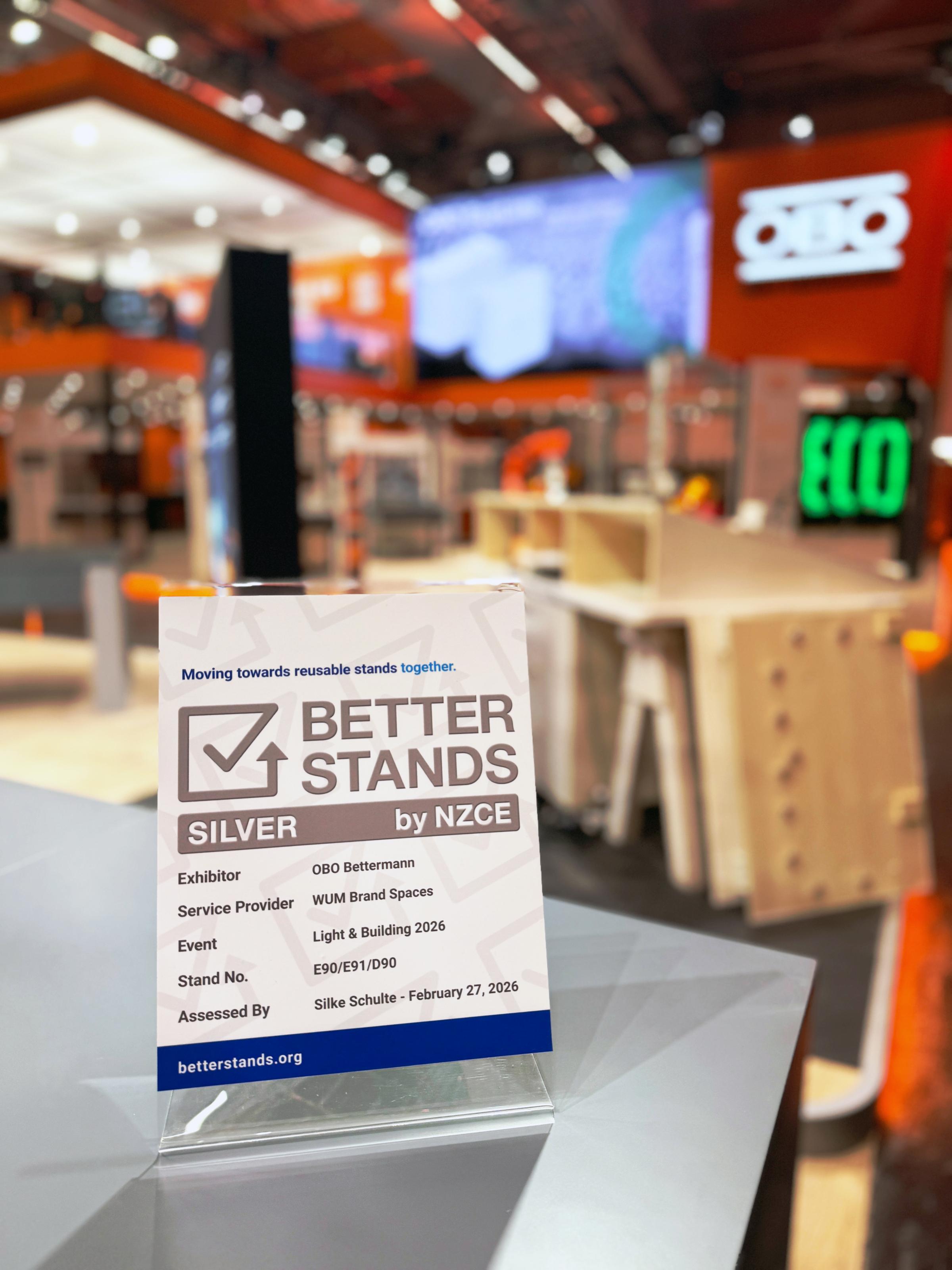 Nachhaltigkeit, die sichtbar wird: Unser Messestand auf der Light + Building 2026 wurde mit dem Better Stands Silver-Zertifikat ausgezeichnet – einer Initiative von Net Zero Carbon Events (NZCE), die nachhaltige Messekonzepte fördert und aktiv vorantreibt.