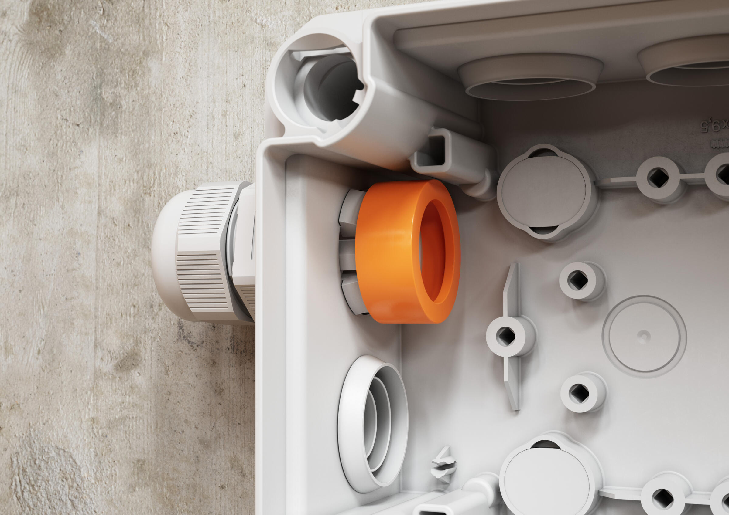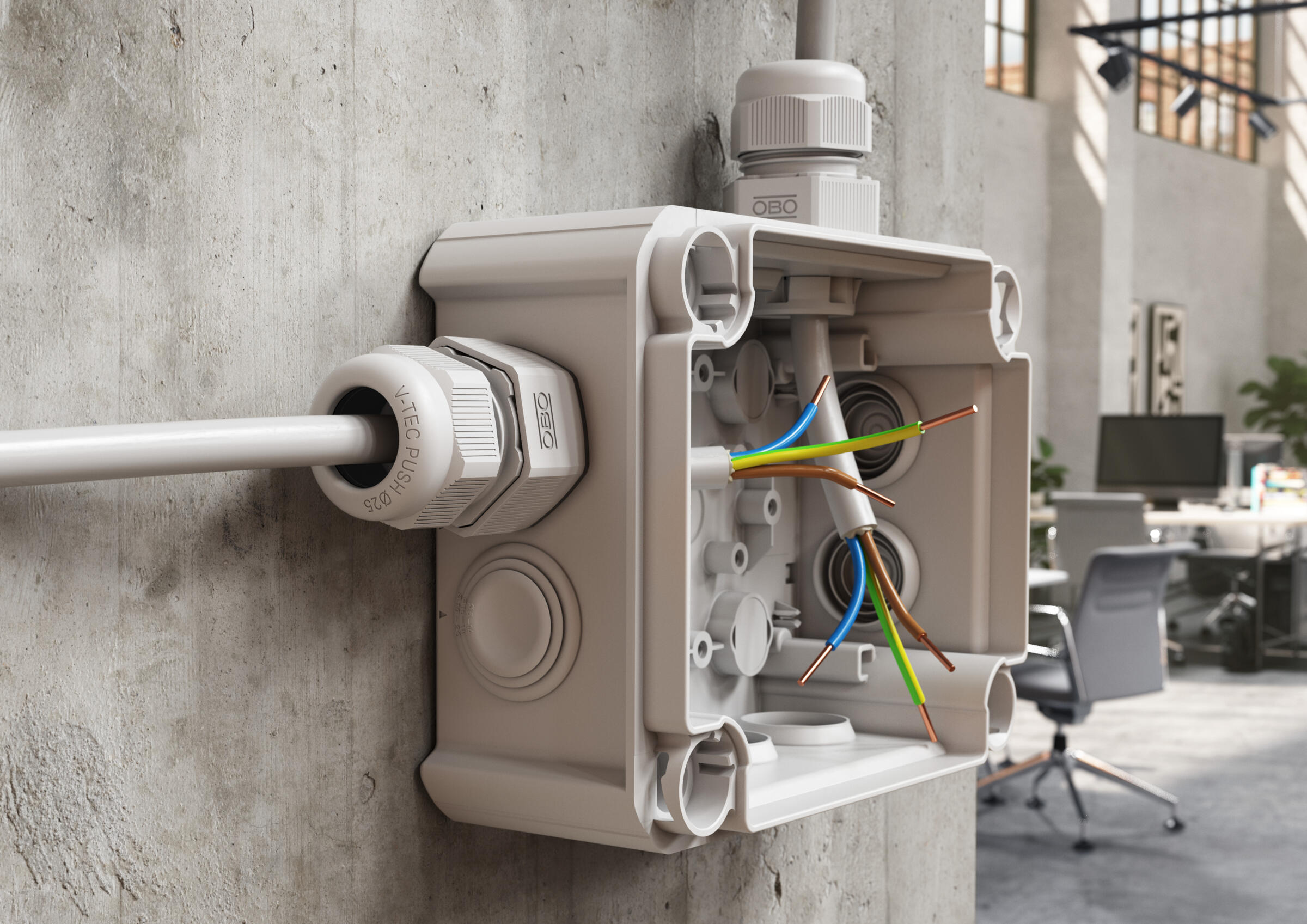 Neu dabei im OBO-Portfolio: Die Kabelverschraubung V-TEC PUSH® sorgt für eine vereinfachte Installation und eine schnellere Anwendung. Durch den patentierten innenliegenden Federmechanismus kann die Kabelverschraubung von außen in das Gehäuse eingesteckt werden. Eine Drehung ist für die Installation nicht erforderlich: Einfach einklicken, fertig. Durch diese Push-in-Montage ergibt sich eine deutliche Zeitersparnis bei der Montage. Flexible Haken an der Kabelverschraubung, die sich nach dem Einstecken aufspreizen, verhindern das Wiederherausziehen.
